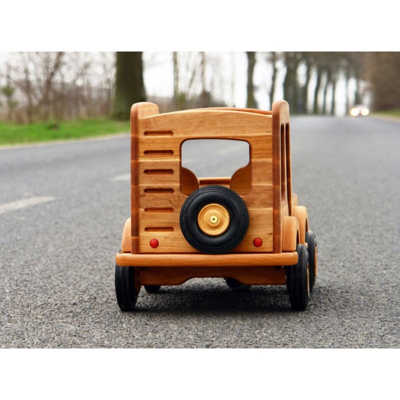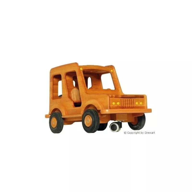Die Motorhaube lässt sich öffnen und dank einer zusätzlichen Rolle unter dem Fahrzeug können sogar kleinere Kinder den Geländewagen mühelos bewegen. So wird das Spiel mit dem robusten Holzauto noch abwechslungsreicher.