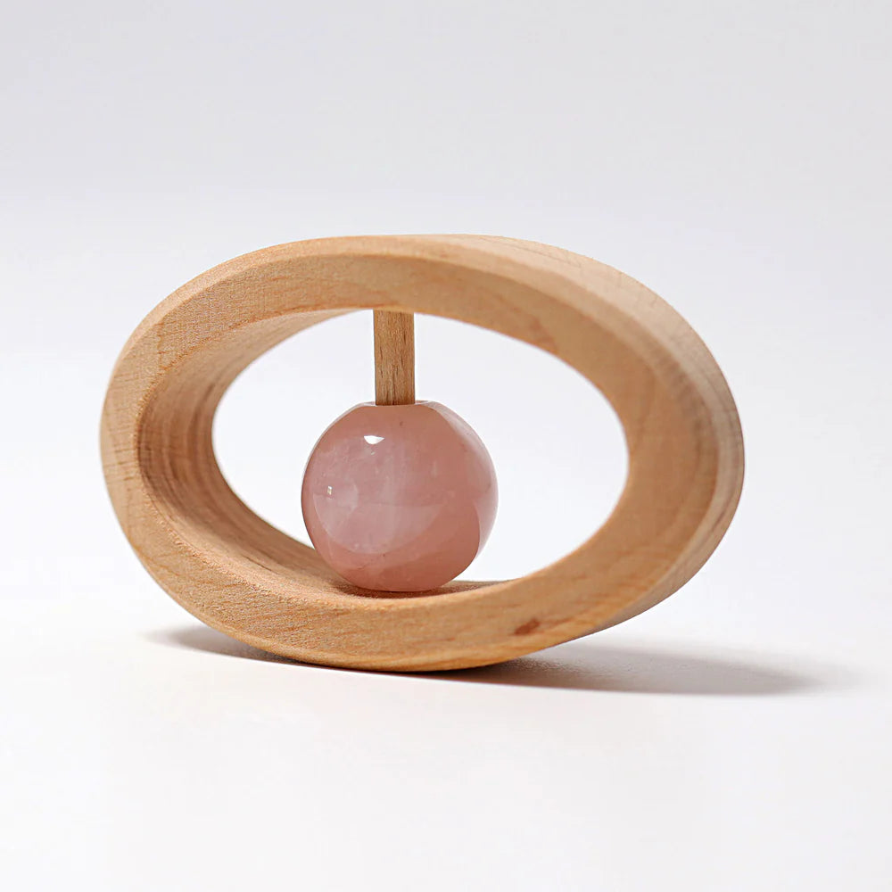 Diese besondere Rassel verbindet warmes, glattes Holz mit einer kühlen Rosenquarz-Perle. Wenn du sie in der Hand hältst, kannst du den spannenden Unterschied zwischen den beiden Materialien fühlen – und beim Schütteln ein sanftes Rasseln hören.