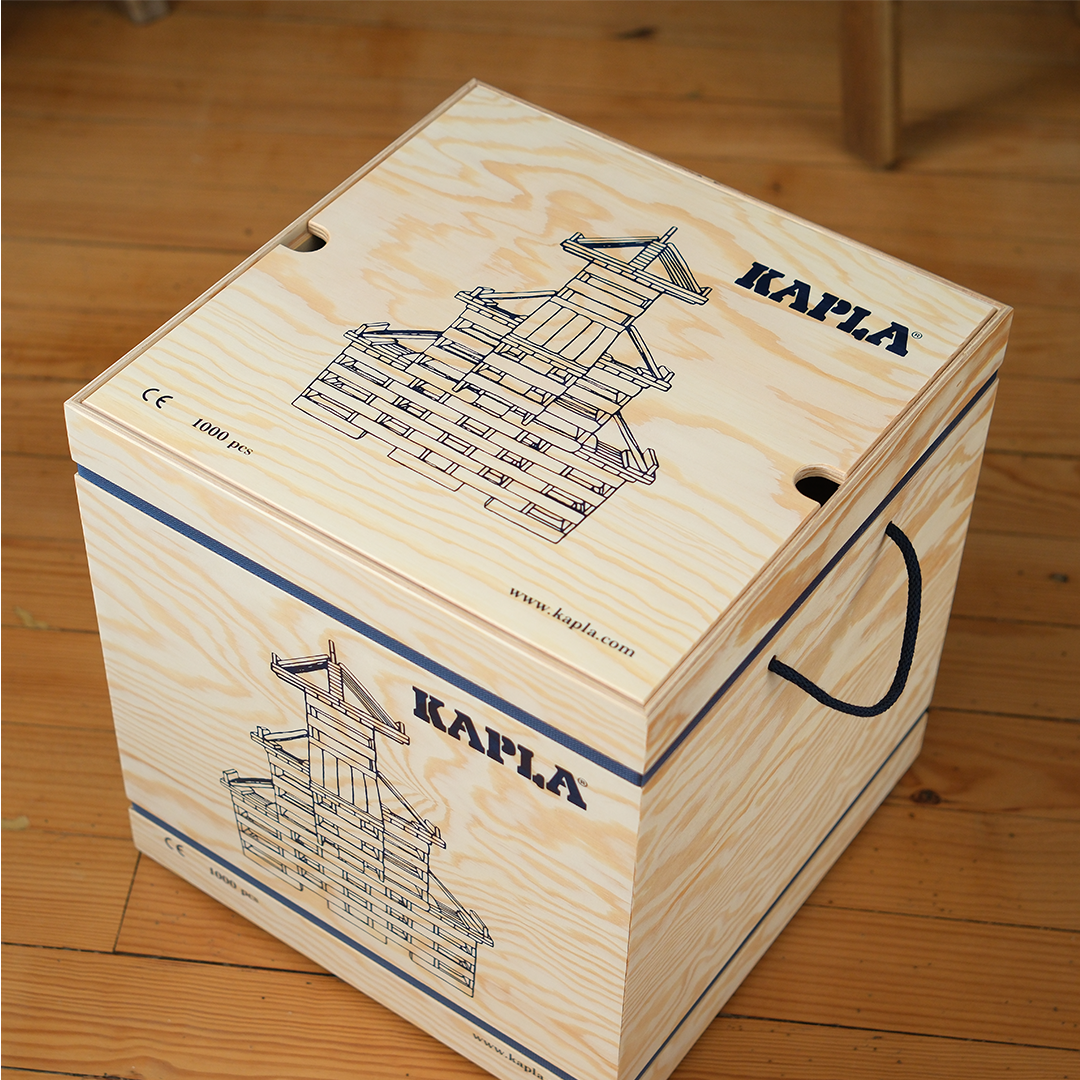 In dieser hübschen, bedruckten Holzkiste befinden sich 1000 KAPLA-Plättchen aus Pinienholz sowie 2 Anleitungshefte. 1000 Holzplättchen sind ganz schön schwer, daher hat diese Kiste praktische Rollen und Griffe.