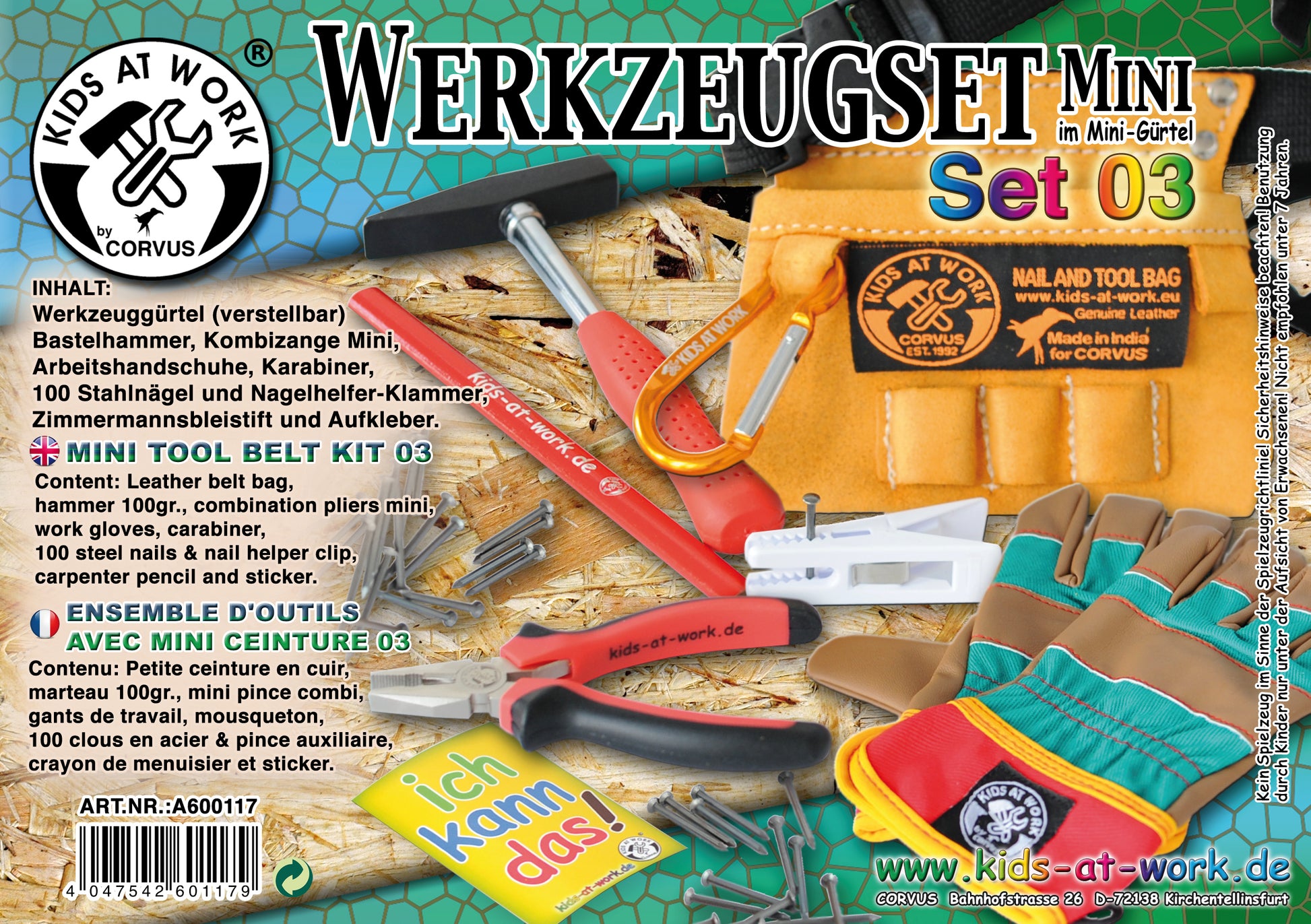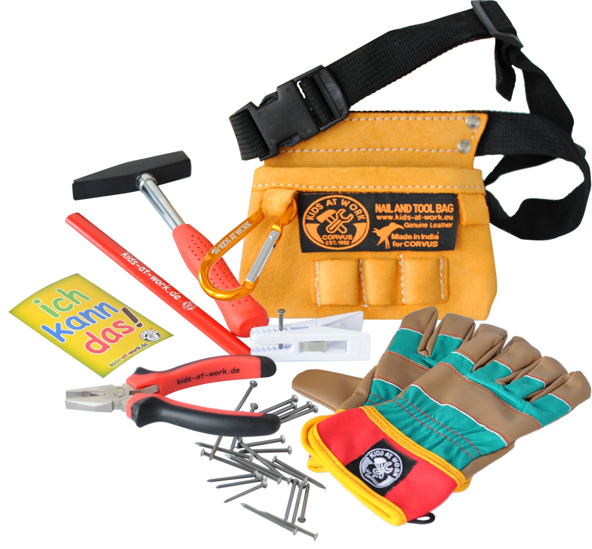 Echt lederner Werkzeuggürtel in kleiner Ausführung mit kleinem Zimmermannshammer, Zwickzange- Mini, Nägeln und zwei Karabinerhaken zum praktischen befestigen weiterer Werkzeuge.