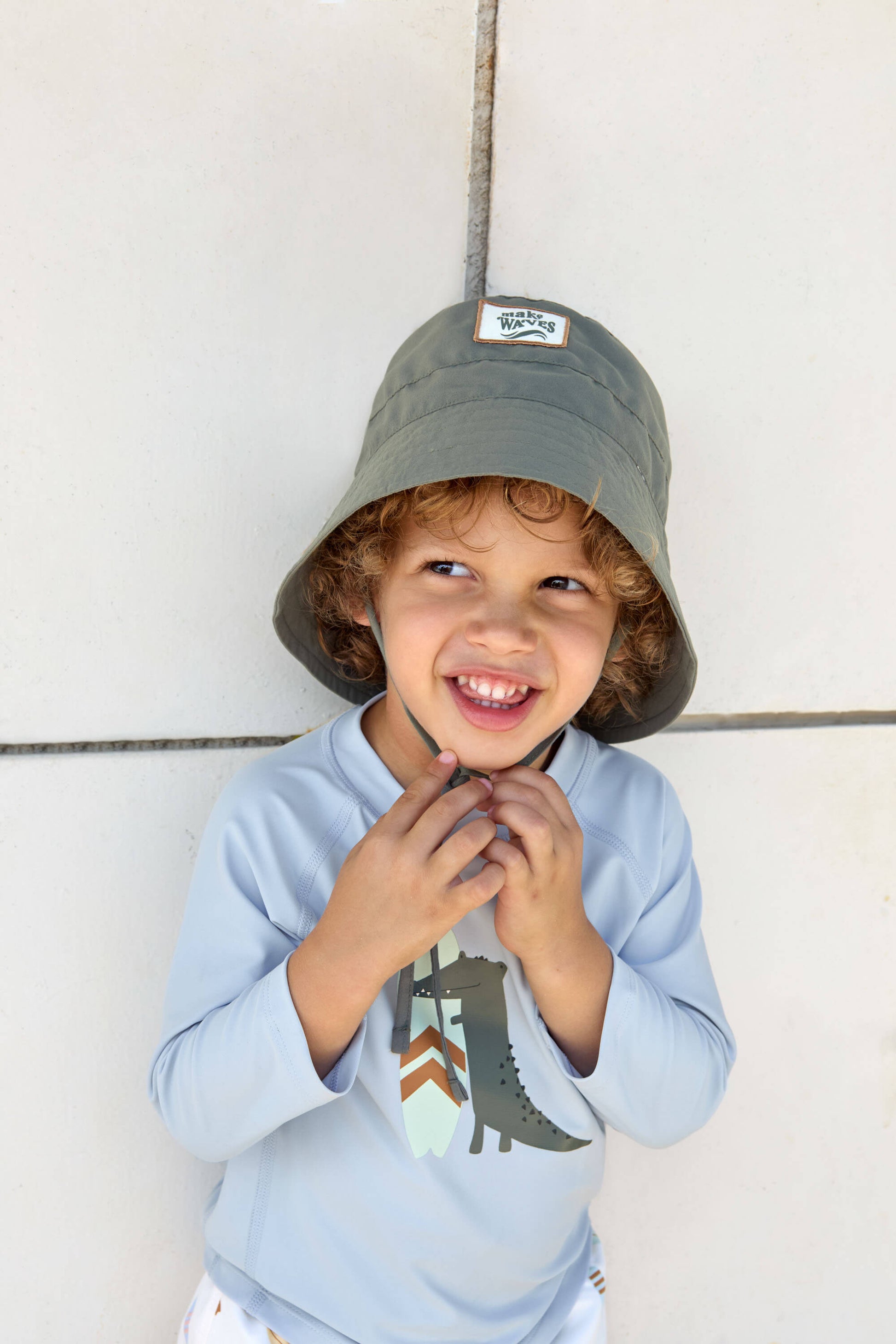 Hellblaues, langärmliges UV-Shirt für Kinder mit fröhlichem Krokodil-Print. Mit einem UV-Schutzfaktor von 60 bietet es optimalen Schutz beim Spielen im Wasser und an Land. Das weiche, atmungsaktive und schnelltrocknende Material sorgt für hohen Tragekomfort und unbeschwerten Badespaß.