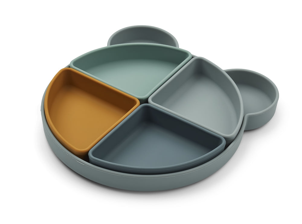 Der Arne Trennteller teilt das Essen in vier Schalen, sodass das Kind nach Belieben mischen kann.
