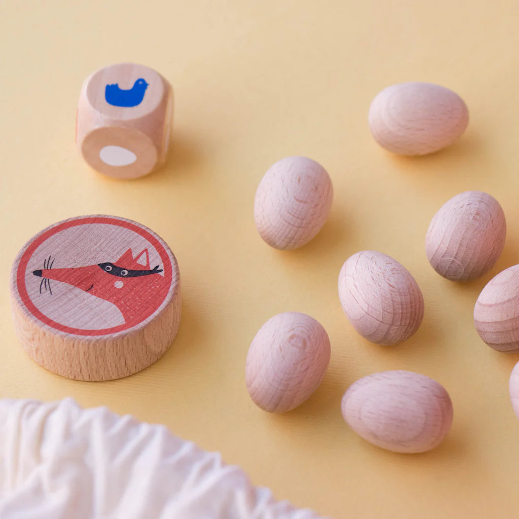 Der Würfel zeigt an, ob ein oder zwei Eier oder sogar ein Huhn gerettet werden dürfen. Doch Achtung: Manchmal rückt auch der Fuchs näher. Jetzt müssen die Spielerinnen und Spieler gemeinsam überlegen, welche Entscheidung die beste ist.