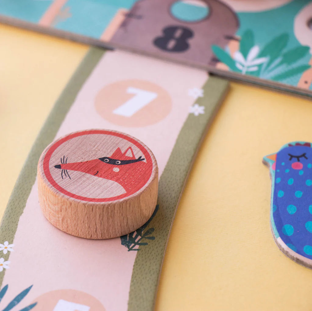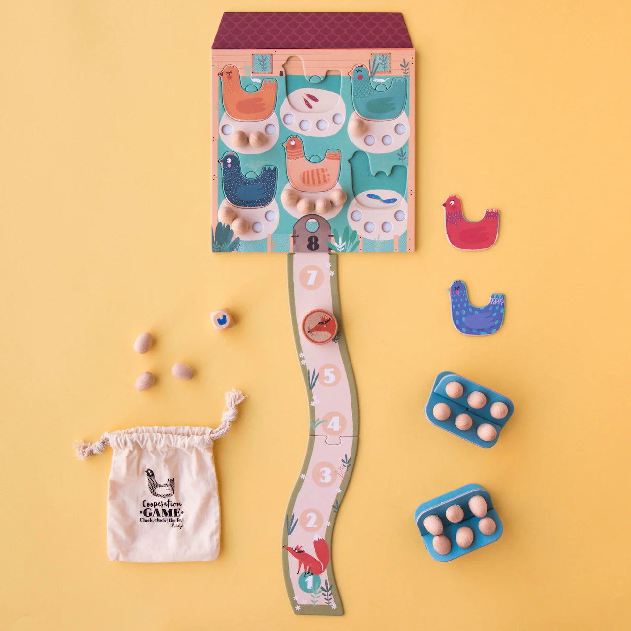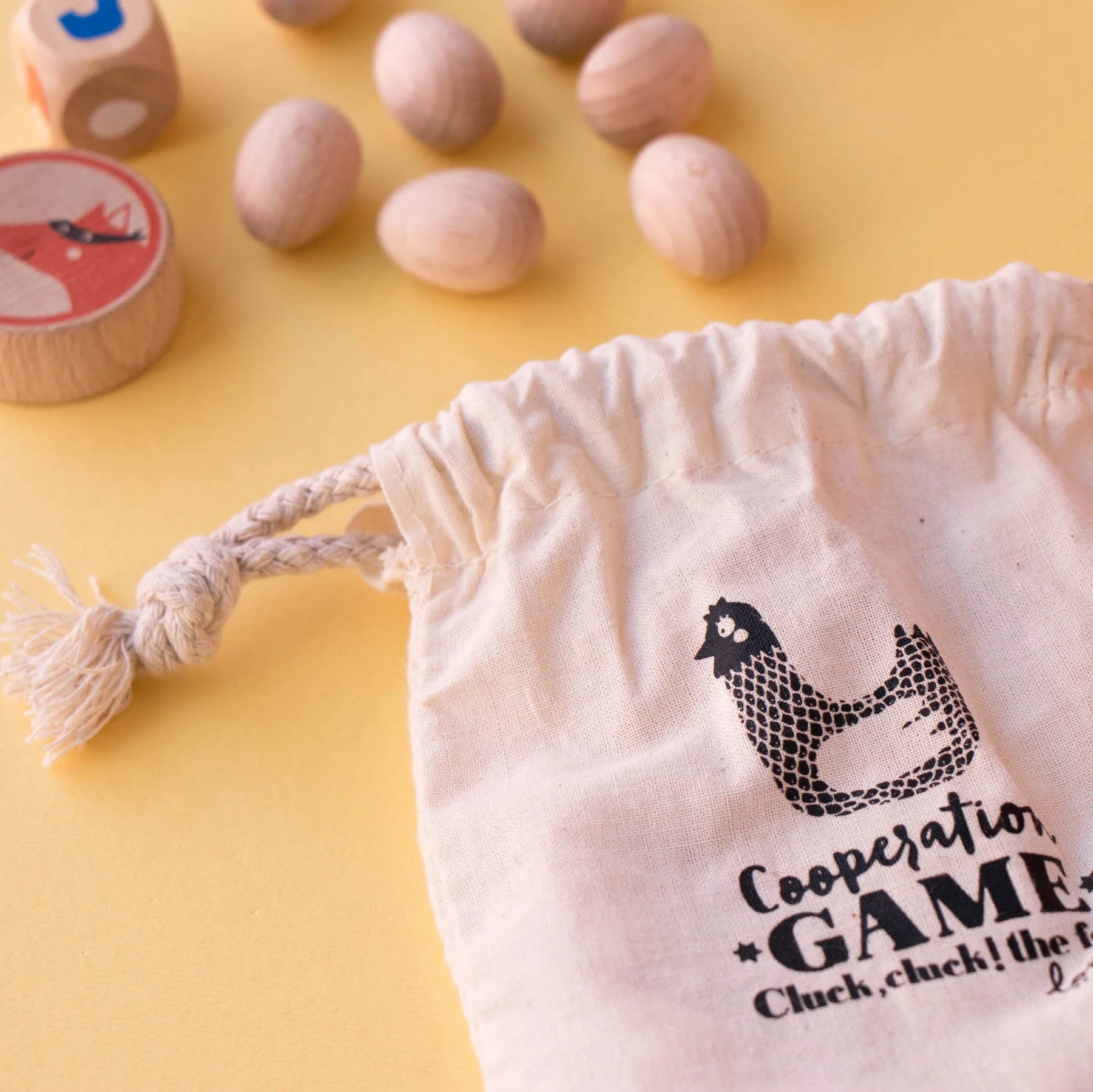 „Cluck, cluck! The fox!“ ist ein spannendes Spiel für Kinder ab 4 Jahren. Es fördert das Zählen, die Zusammenarbeit im Team und sorgt für jede Menge Spielspaß. Die stabilen Karten bestehen aus FSC-zertifizierter Pappe und lassen sich leicht greifen. Alles wird in einem praktischen Jutebeutel geliefert – perfekt auch für unterwegs.