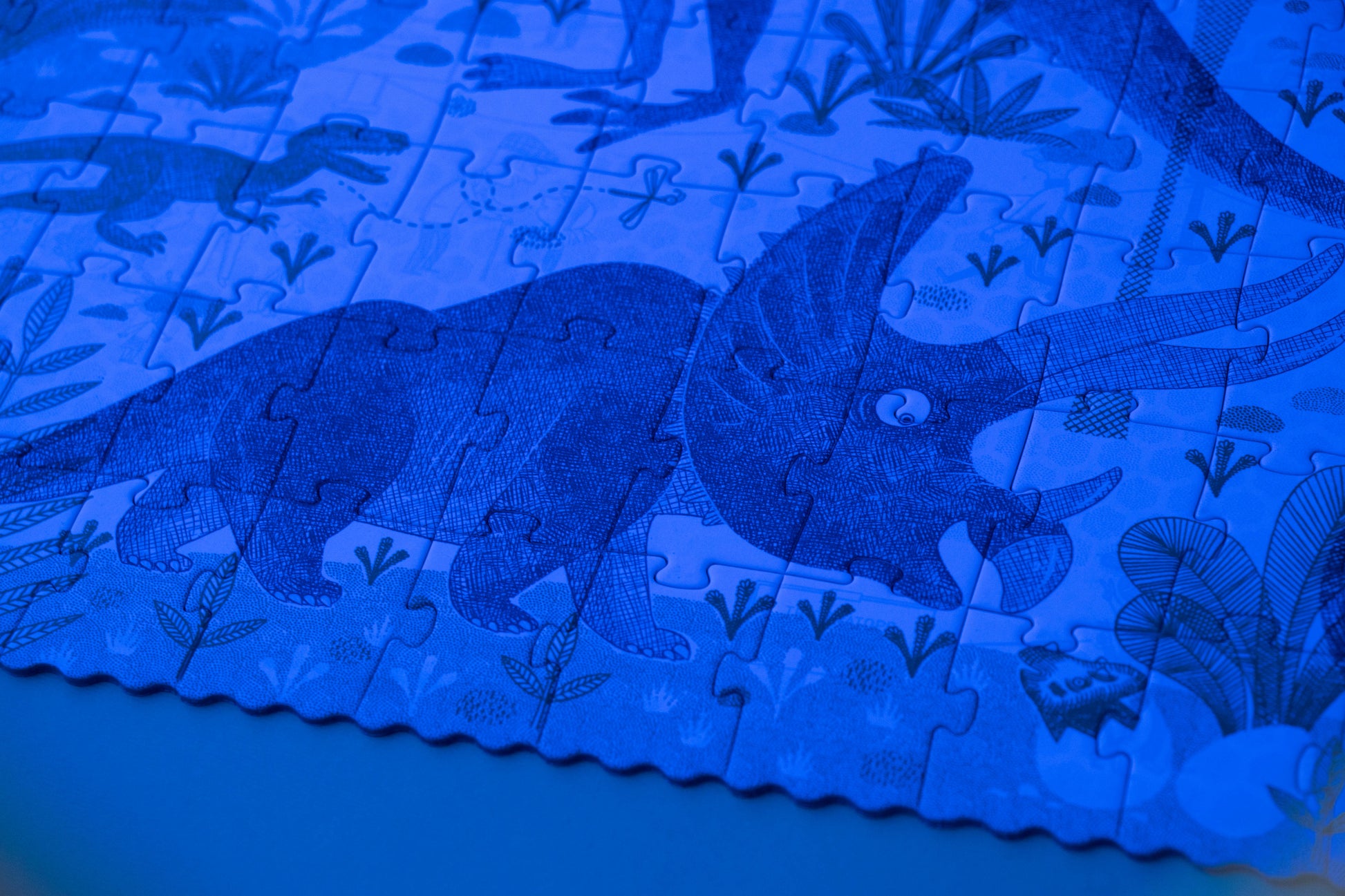 Discover the Dinsoaurs Puzzle in Rot, Blau und Gelb. Dieses Puzzle kombiniert gleich 2 Bilder von Dinosauriern miteinander die mit den jeweiligen „magischen Lupen“ gesehen werden können. So entdecken Ihre Kleinen die Welt der Uhrzeit- Giganten auf eine spielerische Art und Weise.
