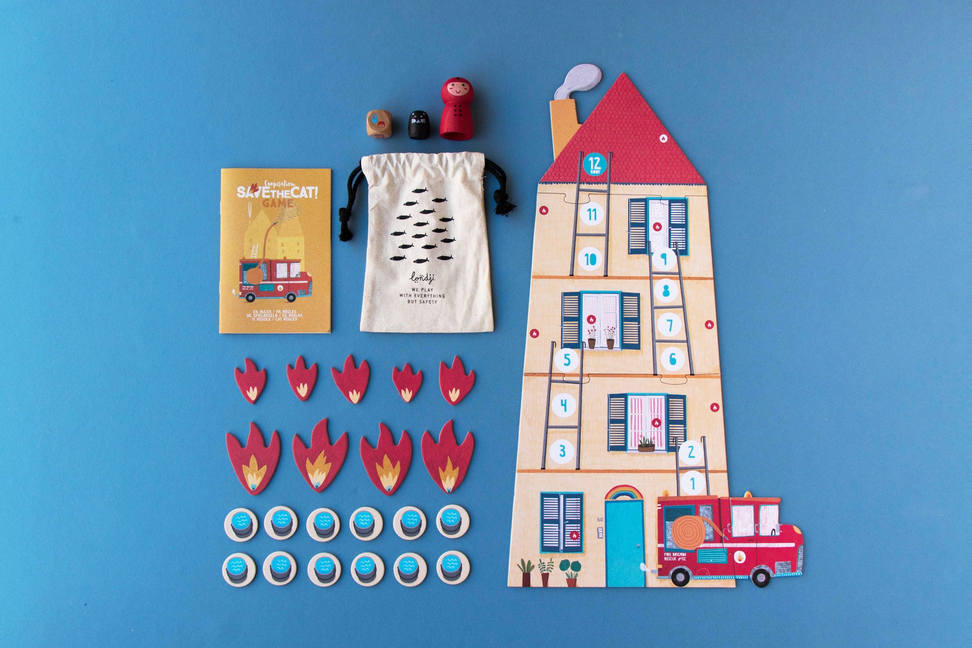 Save the Cat! von Londji ist ein liebevoll gestaltetes kooperatives Brettspiel für Kinder von 4 bis 8 Jahren – bei dem alle zusammen an einem Ziel arbeiten: Die Feuerwehr muss ein brennendes Haus löschen und eine Katze vom Dach retten!