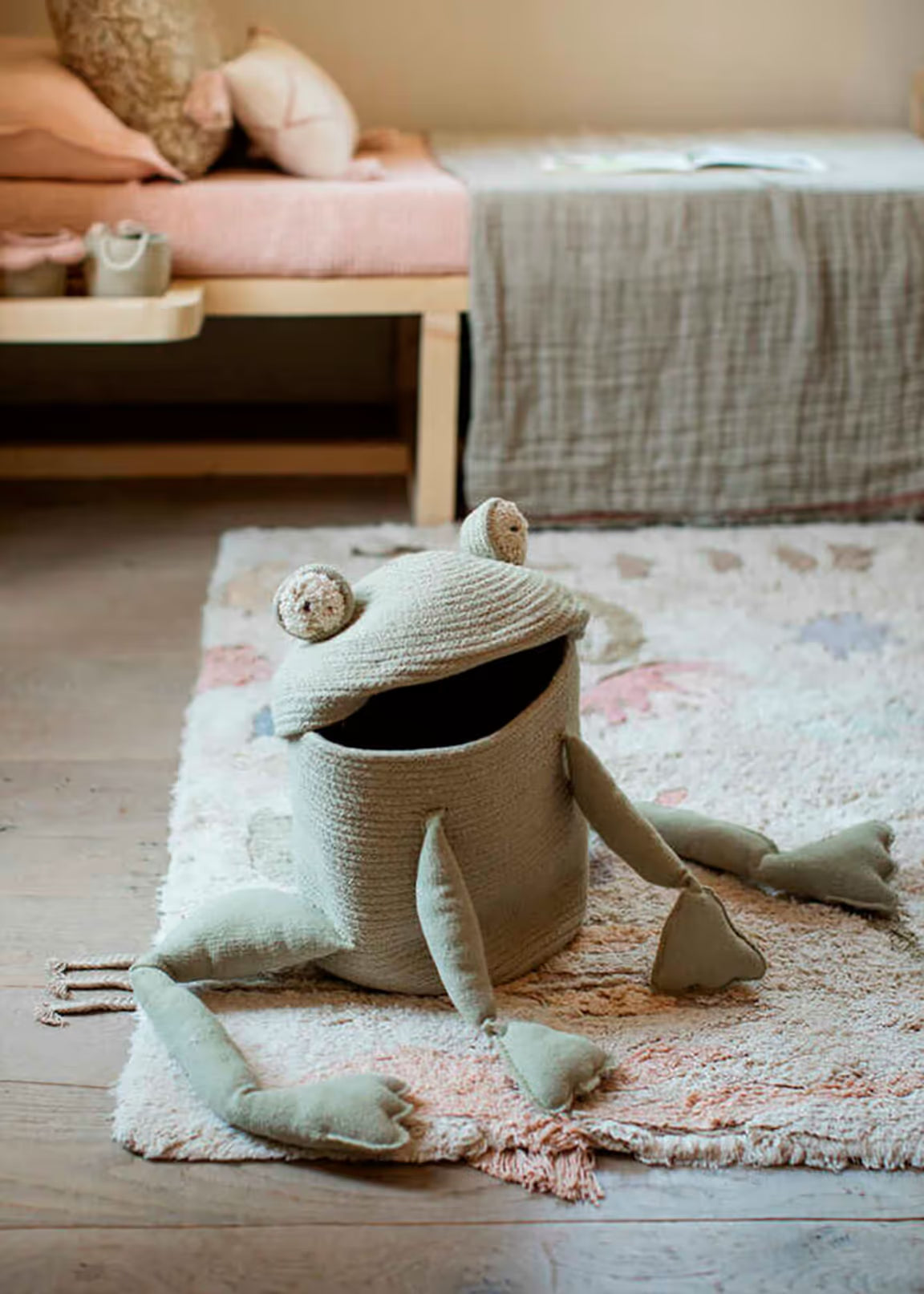 In einem bunten Garten voller Fantasie lebt Fred, der fröhliche Frosch. Er ist kein gewöhnlicher Frosch – Fred ist ein kuscheliger, grüner Korb, der gerne all die kleinen Schätze bewahrt, die dir wichtig sind. Ob Bausteine, Kuscheltiere, Bücher oder geheimnisvolle Fundstücke: Fred passt gut darauf auf.