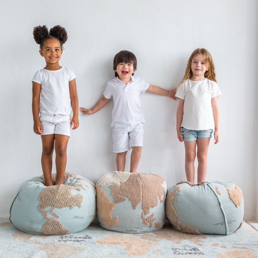 Das dezente Erdton-Farbspiel und die detailreiche Weltkarte machen ihn zu einem lehrreichen Accessoire, das sich wunderbar ins Kinderzimmer, Wohnzimmer oder in die Leseecke einfügt.