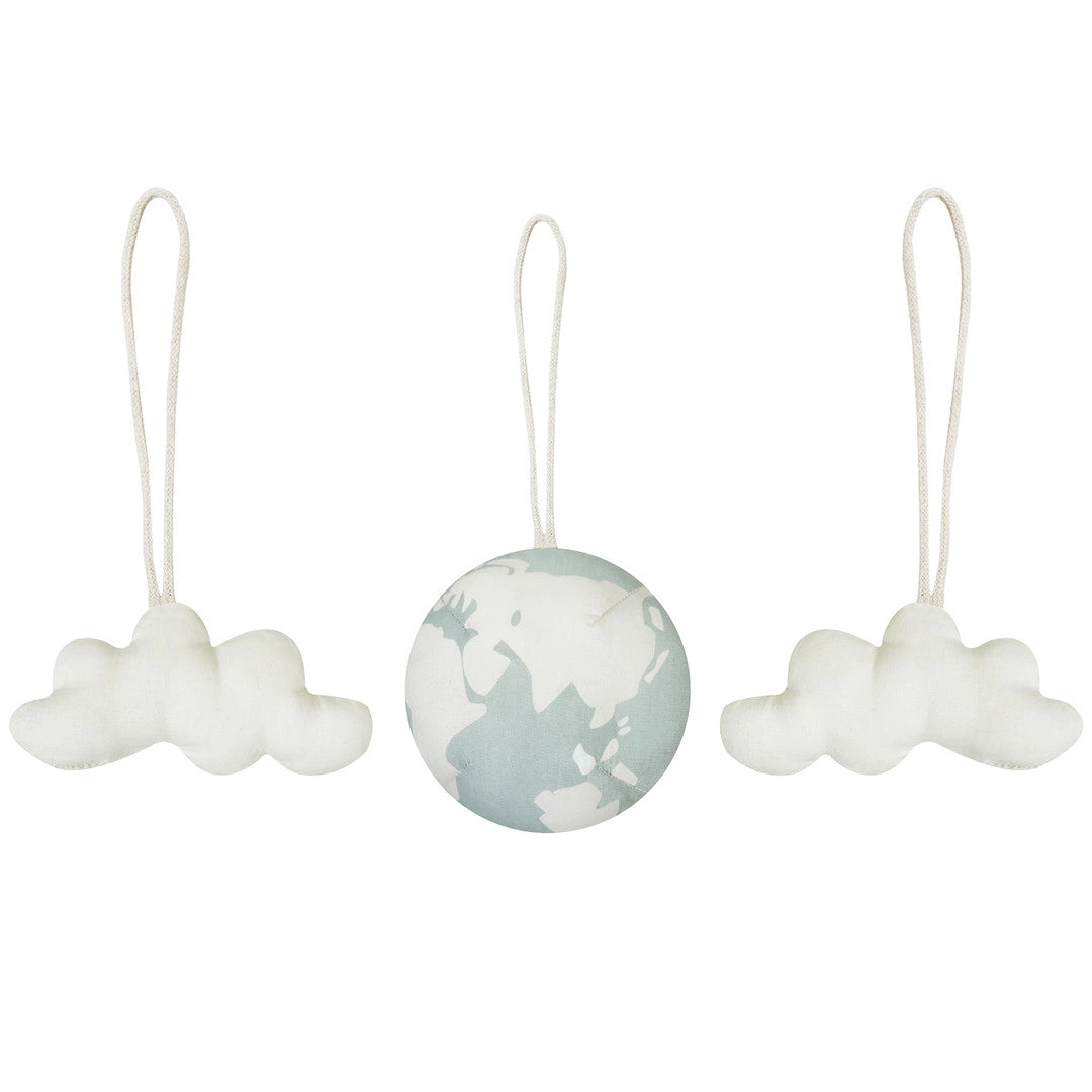 Dieses handgefertigte Spielset mit liebevollen Motiven lädt Babys zum Entdecken ein. Die weiche Weltkugel und die beiden Wolken sind aus 100 % Bio-Baumwolle gefertigt und mit GRS-zertifiziertem, recyceltem Polyester gefüllt. Eine integrierte Rassel und Knisterelemente wecken Neugier, fördern die Sinne und regen zum Greifen an.