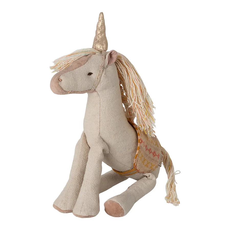 Eine magische Geschichte beginnt. Mit diesem Einhorn in bunten Tönen und einem goldenen Horn gibt es viele Geschichten zu erzählen. Das Einhorn wird mit einem Sattel für eine komfortablen Ritt geliefert.