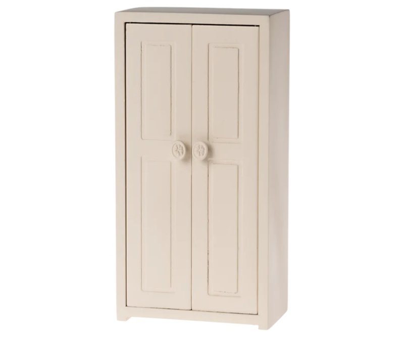 Ein kleiner Schrank auf Holz. Er hilft der Mäusefamilie, ihre Garderobe zu organisieren. Der Schrank wird mit 3 goldenen Kleiderbügeln geliefert.