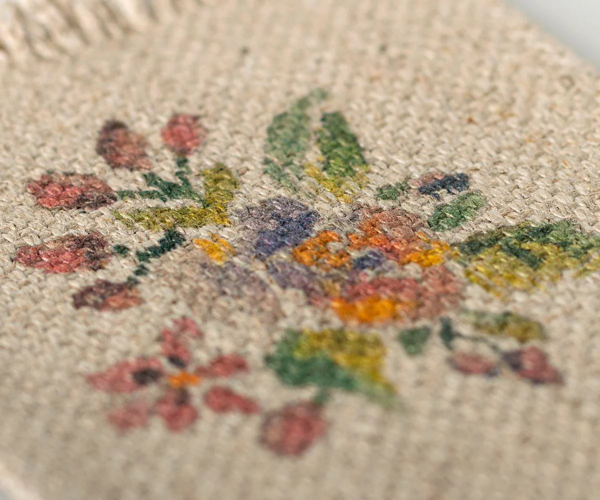 Gestalte Dein Puppenhaus noch gemütlicher mit diesem kleinen Maileg-Teppich. Auf dem hellbeigen Hintergrund erblühen zarte Blumen in Pink, Gelb, Lila und Grün und bilden ein dekoratives Muster in der Mitte.