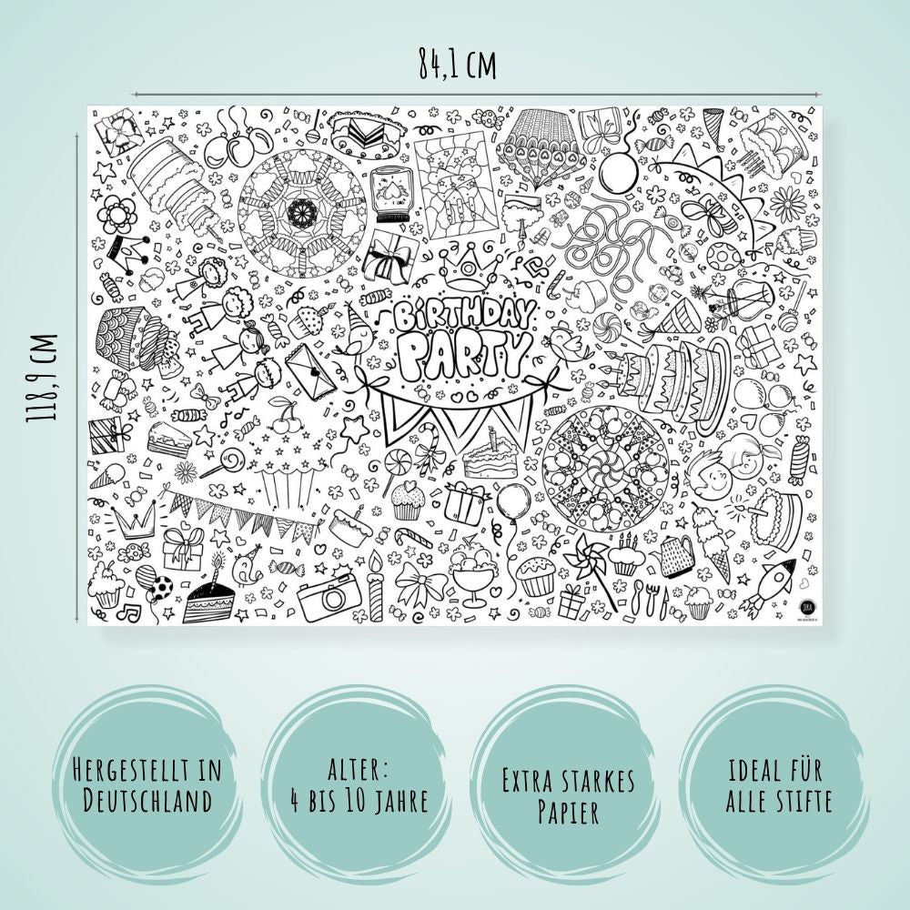 Happy Birthday! Diese liebevoll gestaltete Ausmal-Tischdecke bringt Farbe und Stimmung auf jede Geburtstagsparty.