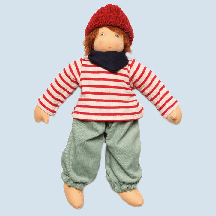 Die Anziehpuppe Mats ist ein fröhlicher Spielkamerad, der dich überallhin begleitet. Mit seinen weichen Mohair-Haaren, der roten Mütze und seinem freundlichen, handbemalten Gesicht bringt er sofort gute Laune ins Spiel.