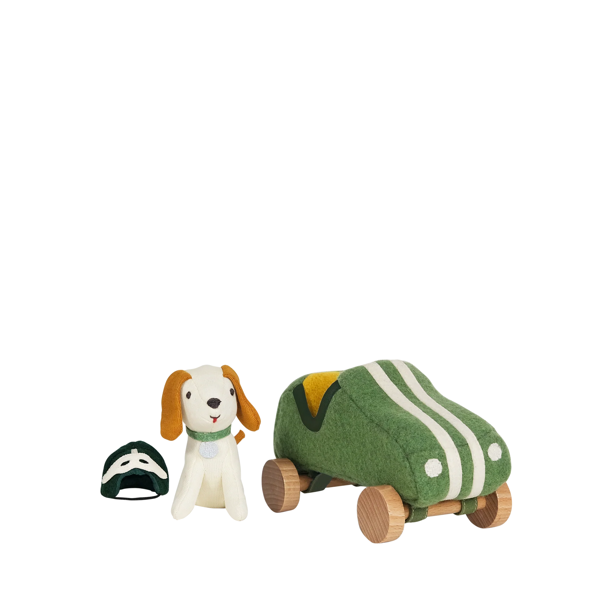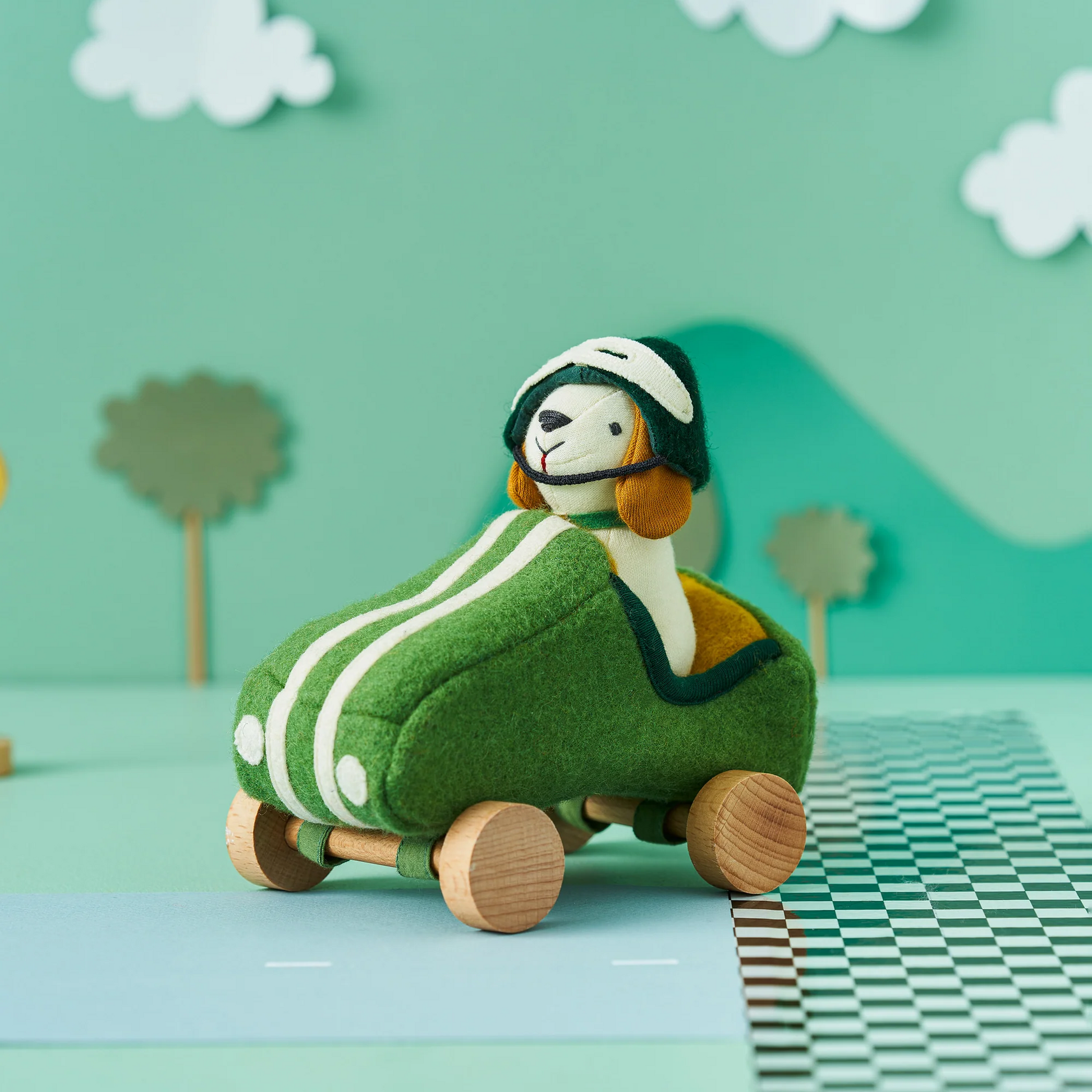 Die Figur ist aus einer Wollmischung gefertigt, mit gestickten Details versehen und sitzt in einem klassischen Rennwagen mit Holzrädern. Der feste Kragen und der abnehmbare Helm runden das detailreiche Design ab. Dank der handlichen Größe eignet sich Racer Boy perfekt für kleine Kinderhände und fördert fantasievolles Spiel.