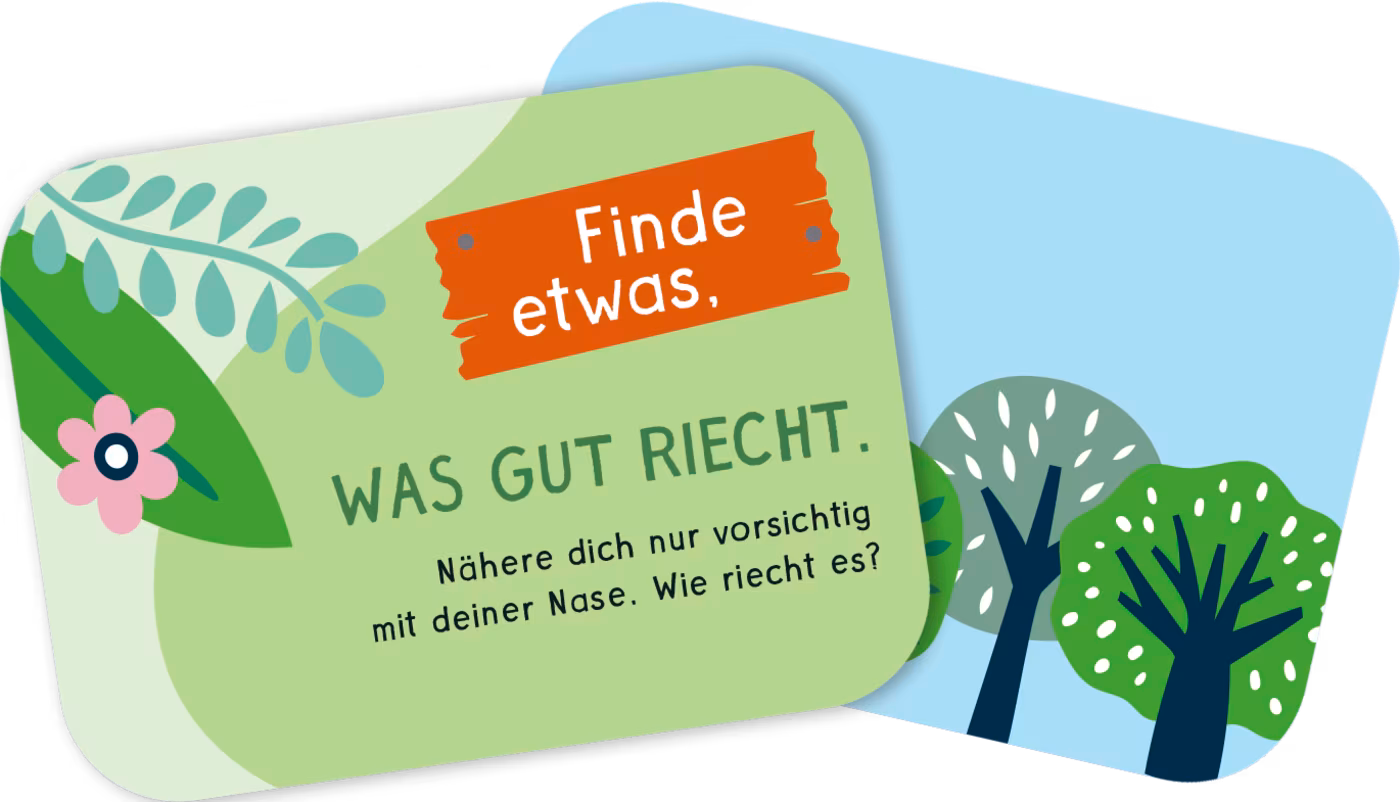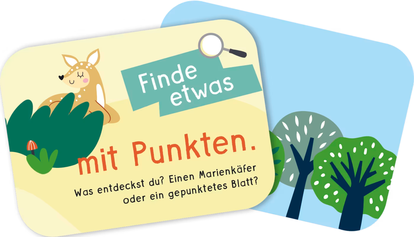 Manchmal ist es gar nicht so einfach, bei Kindern die Begeisterung für einen Spaziergang aufrechtzuerhalten. "Meine Schatzsuche in der Natur" verwandelt jeden Spaziergang in ein spannendes Abenteuer. Auf 25 Kärtchen lädt sie auf eine achtsame Schatzsuche in die Natur ein, mit lustigen Aufgaben wie „Finde Dinge, die so groß sind wie du", "die aussehen wie eine Hand" oder "Finde etwas mit Punkten". So lernen auch schon die Kleinsten spielerisch den achtsamen Umgang mit Natur und Umwelt. Einfach eine Karte auswählen, Augen auf und los geht die Suche!