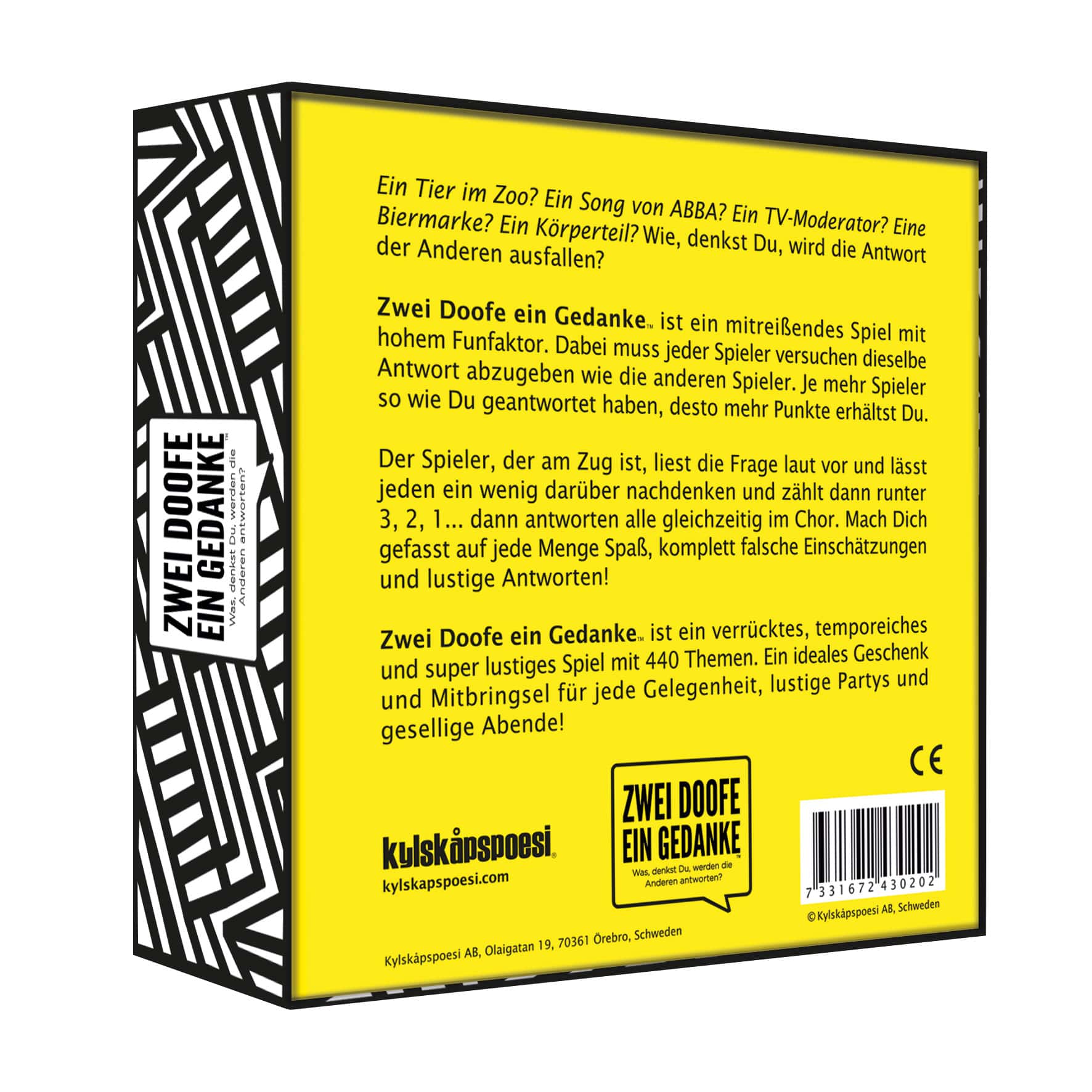 Ein Tier im Zoo? Ein Song von ABBA? Ein TV-Moderator? Eine Biermarke? Ein Körperteil? Wie, denkst Du, wird die Antwort der Anderen ausfallen? Zwei Doofe ein Gedanke ist ein mitreißendes Spiel mit hohem Funfaktor. Dabei muss jeder Spieler versuchen dieselbe Antwort abzugeben wie die anderen Spieler. Je mehr Spieler so wie Du geantwortet haben, desto mehr Punkte erhältst Du.