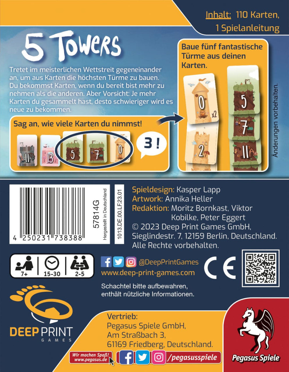 In 5 Towers treten die Spielenden in einem meisterlichen Wettstreit gegeneinander an, um die höchsten Türme zu bauen. Jede Runde werden 5 Karten mit Turmabschnitten aufgedeckt und alle bieten reihum, wie viele dieser Karten sie nehmen möchten. Die Person mit dem höchsten Gebot nimmt sich die angesagte Anzahl und baut diese an ihre Türme an. Aber es dürfen nur unterschiedliche Türme gebaut werden und jeder davon muss sortenrein sein. Zudem müssen die Zahlenwerte auf den Karten von unten nach oben immer kleiner werden. Je schneller also gebaut wird, desto schwieriger wird es, überhaupt Gebote abzugeben.