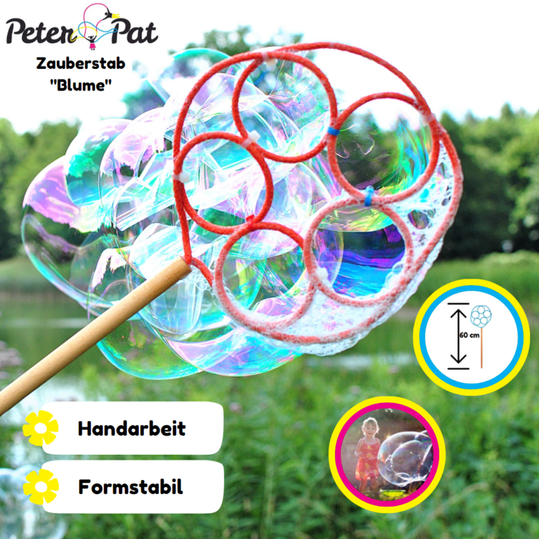 Einfach die Figur in Seifenblasenflüssigkeit tauchen, in den Wind halten – und schon entstehen magische Blasen, die durch die Luft tanzen.