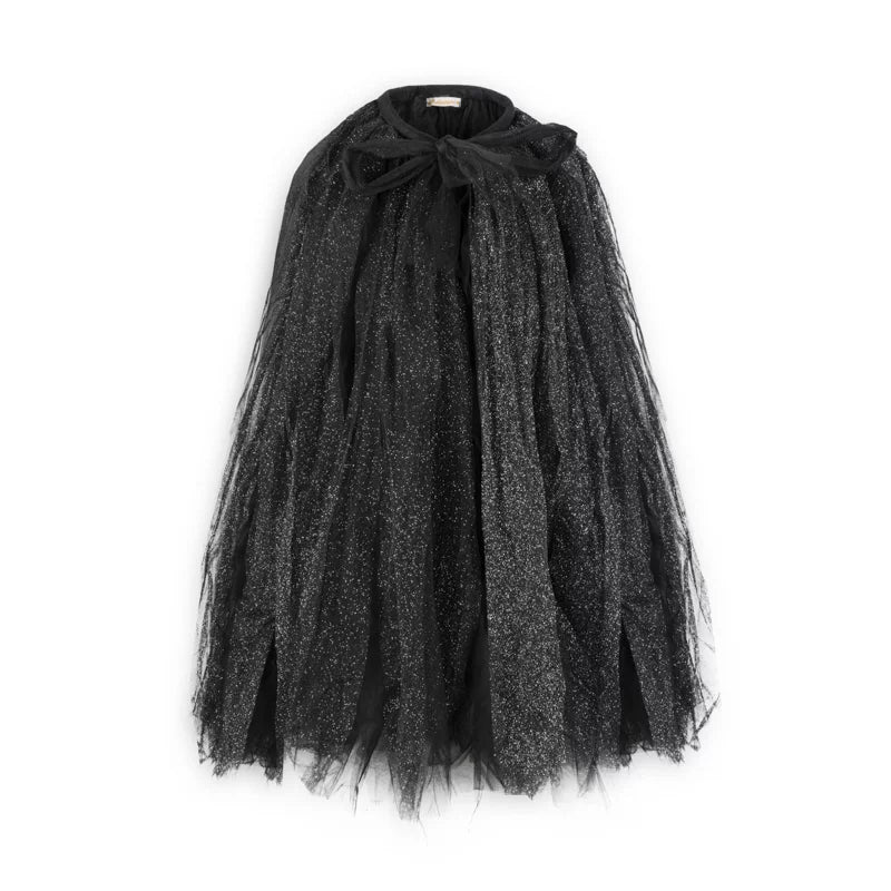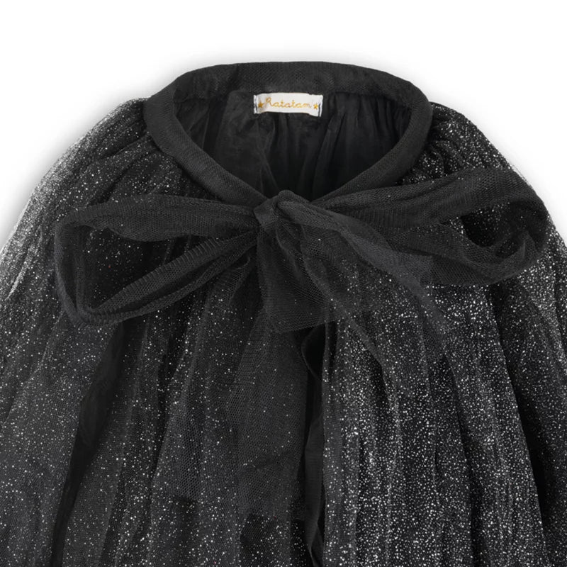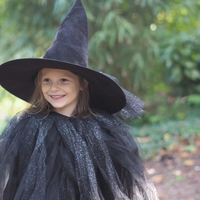 Das Set besteht aus einem schwarzen Tüll-Cape-Rock mit funkelnden silbernen Glitzern. Du kannst ihn als Cape um die Schultern binden oder als Rock um die Taille tragen – ganz, wie es dir gefällt! Dazu passt der schwarze Samt-Hexenhut mit einer kleinen Schleife aus glitzerndem Tüll – perfekt für magische Auftritte.