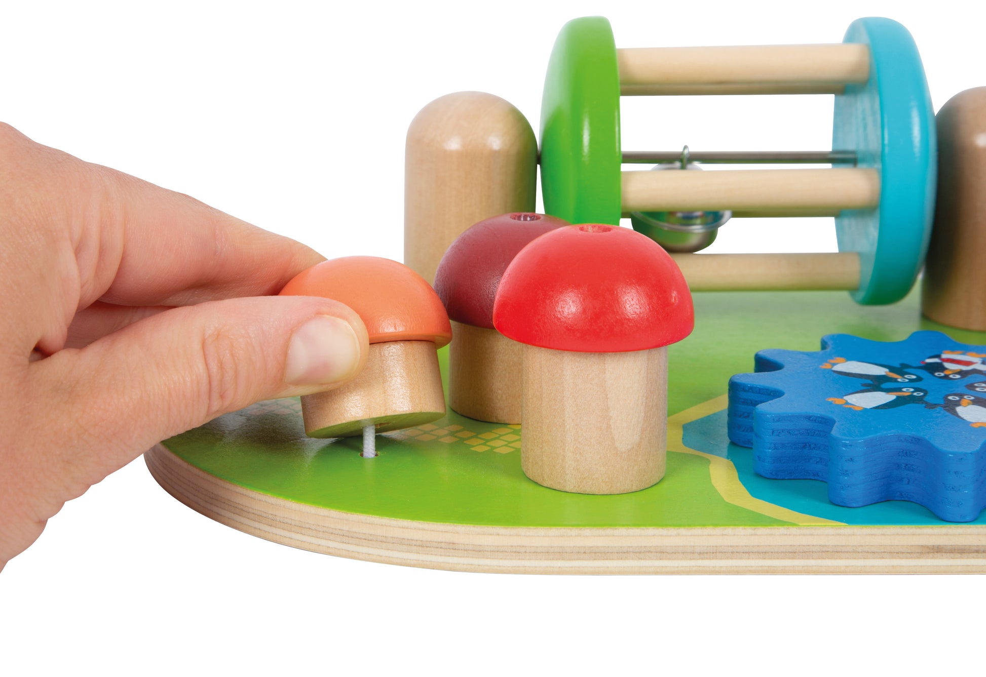 Dieses bunte Motorikboard aus robustem Holz lädt dich zum Klappen, Drehen und Ziehen ein. Dabei übst du ganz spielerisch das Greifen und deine Hand-Augen-Koordination. Die Zahnräder, Klappelemente und die drehbare Rassel sorgen für Abwechslung und spannende Entdeckungen.