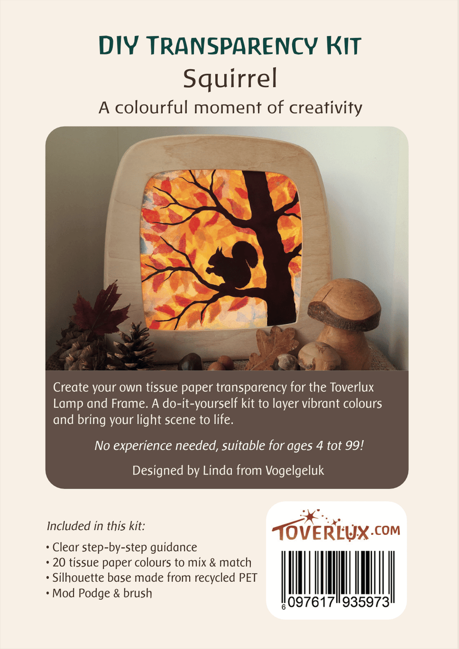 Bringen Sie Wärme, Fantasie und einen Hauch Natur in Ihr Zuhause mit dem liebevoll gestalteten DIY-Transparenz-Kit Eichhörnchen im Baum, entworfen von Linda von Vogel Geluk.