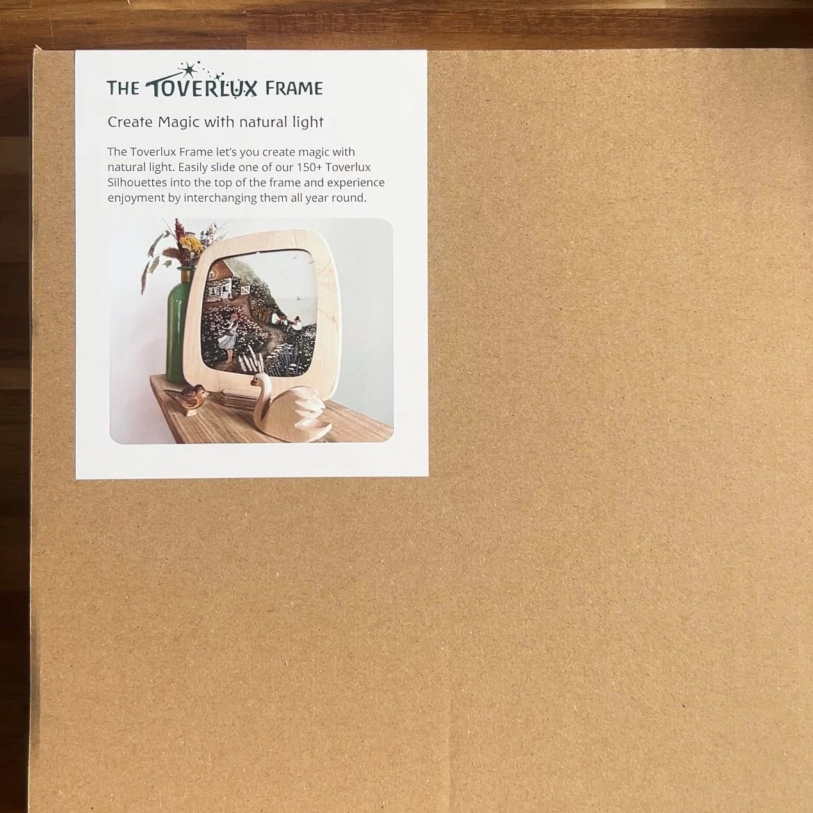 Mit dem Toverlux Holzrahmen wird Sonnenlicht zu einem kleinen Zauber. Der Rahmen aus Holz wird in den Niederlanden von Hand gefertigt und passt perfekt zu unserer stetig wachsenden Sammlung von über 200 Toverlux Silhouetten. Einfach das gewünschte Motiv einschieben – schon verwandelt das Tageslicht das Bild in eine lebendige Szene.