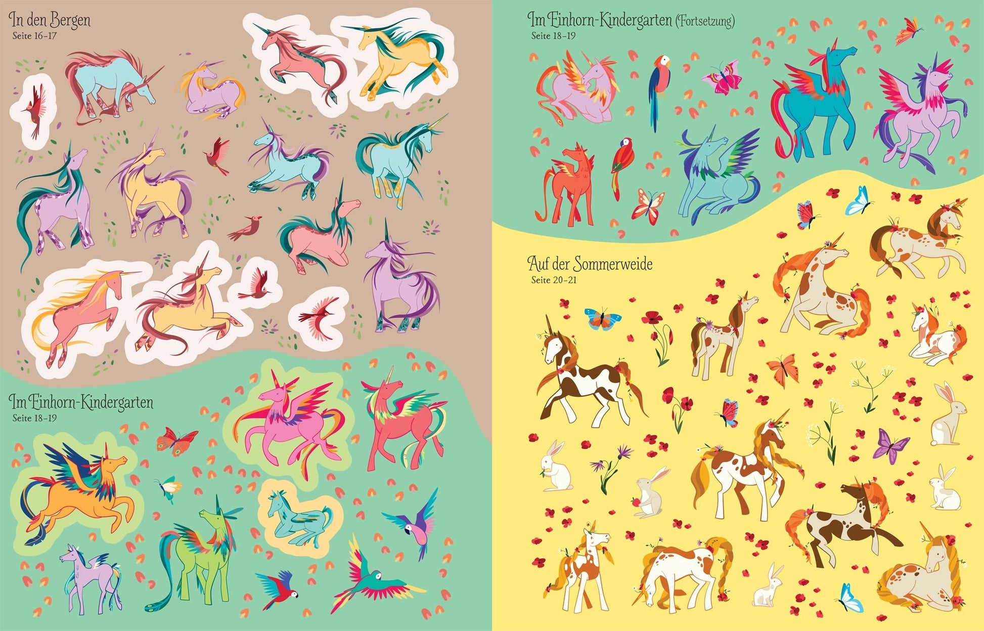 Tauche ein in die magische Welt der Einhörner! In diesem wunderschönen Stickerbuch kannst Du fantastische Szenen mit Leben füllen: Flieg mit den Einhörnern über den Regenbogen, entdecke die funkelnden Gärten des Eisschlosses und begleite niedliche Fohlen beim Großwerden.