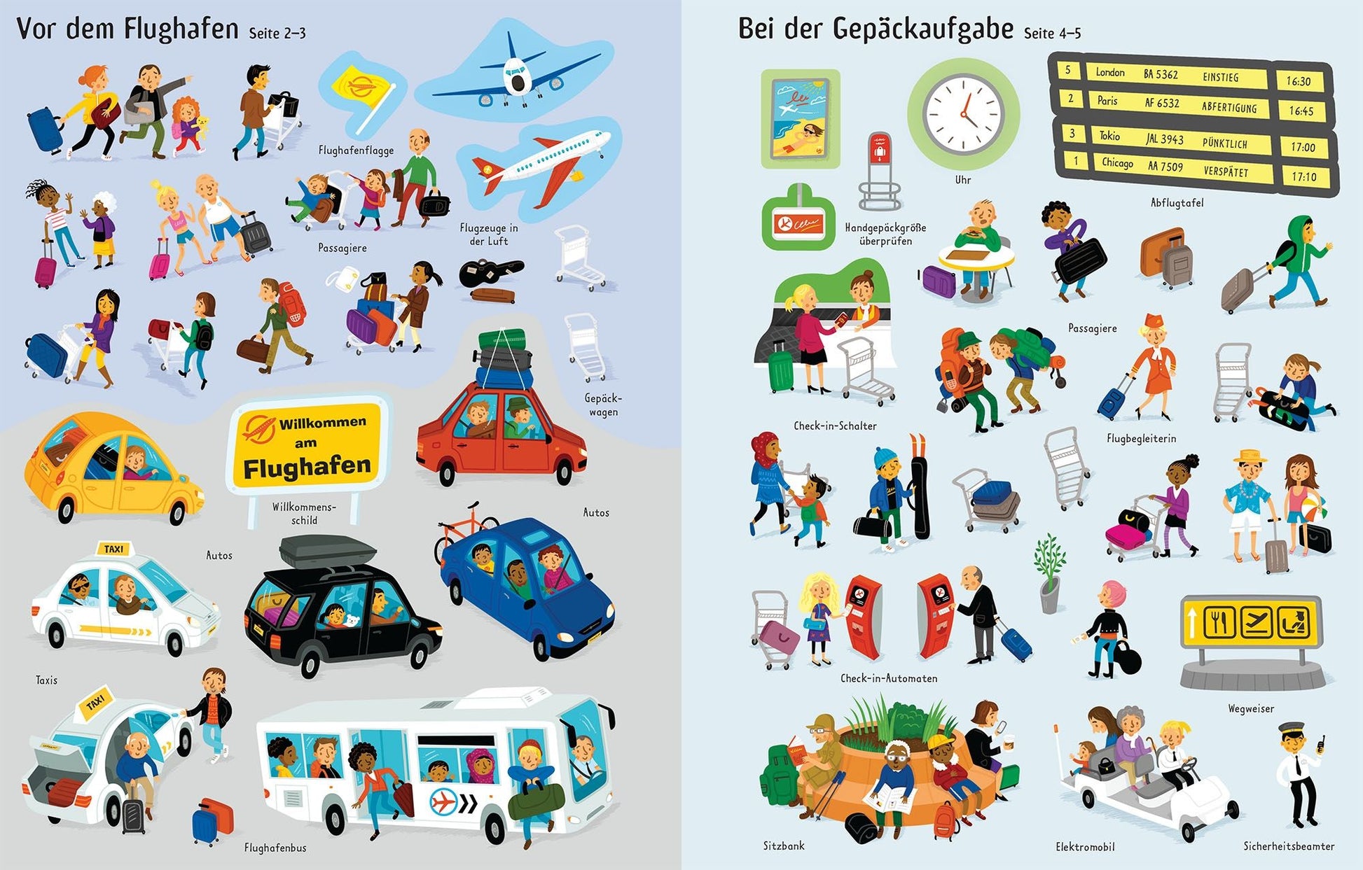 Gepäckaufgabe, Sicherheitskontrolle, Start und Landung - erwecke mit über 200 Stickern die Flughafen-Szenen zum Leben und gestalte auf den Ausmalseiten deine eigenen Flugzeuge.