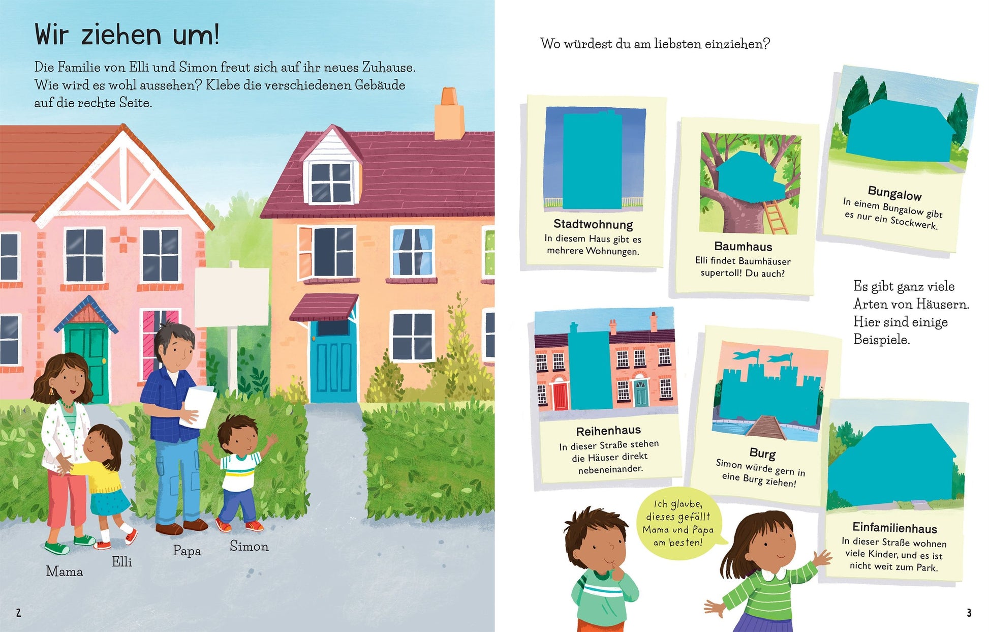 Ein Umzug steckt voller neuer Eindrücke: Möbel werden verpackt, Kisten geschleppt, Zimmer eingerichtet – und am Ende gibt es eine fröhliche Einweihungsparty. Mit über 150 Stickern können Kinder die Szenen selbst gestalten und Schritt für Schritt miterleben, was beim Umziehen alles passiert.