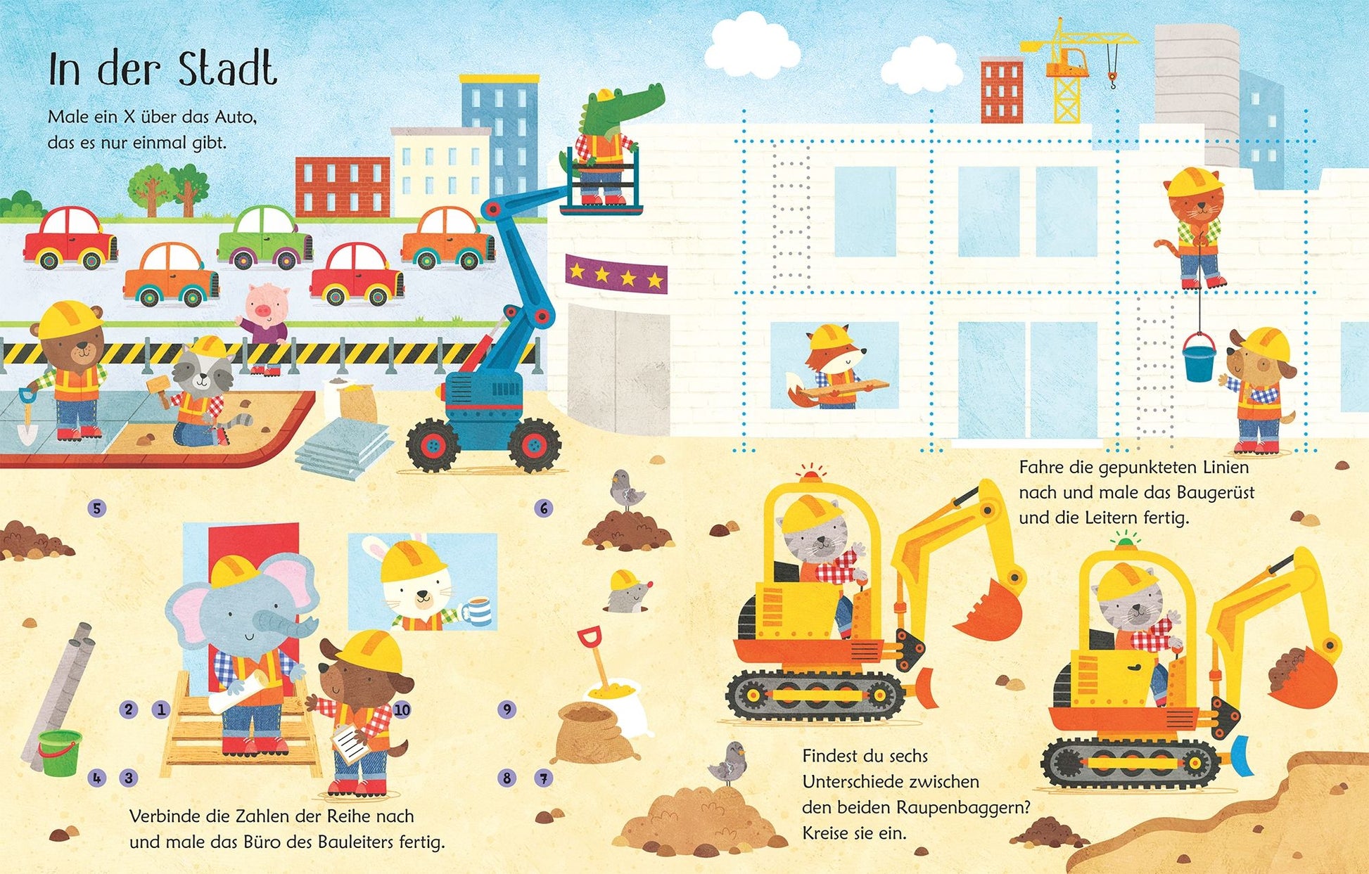 In diesem fröhlichen Buch gibt es jede Menge Labyrinthe, Finde-den-Unterschied- und Punkt-zu-Punkt-Rätsel für kleine Baustellen-Fans. Zahlen und Linien zum Nachfahren üben den sicheren Umgang mit dem Stift. Und falls doch mal was danebengeht: einfach wegwischen und noch mal versuchen.