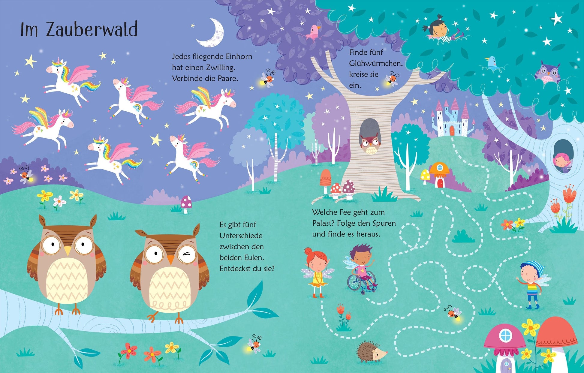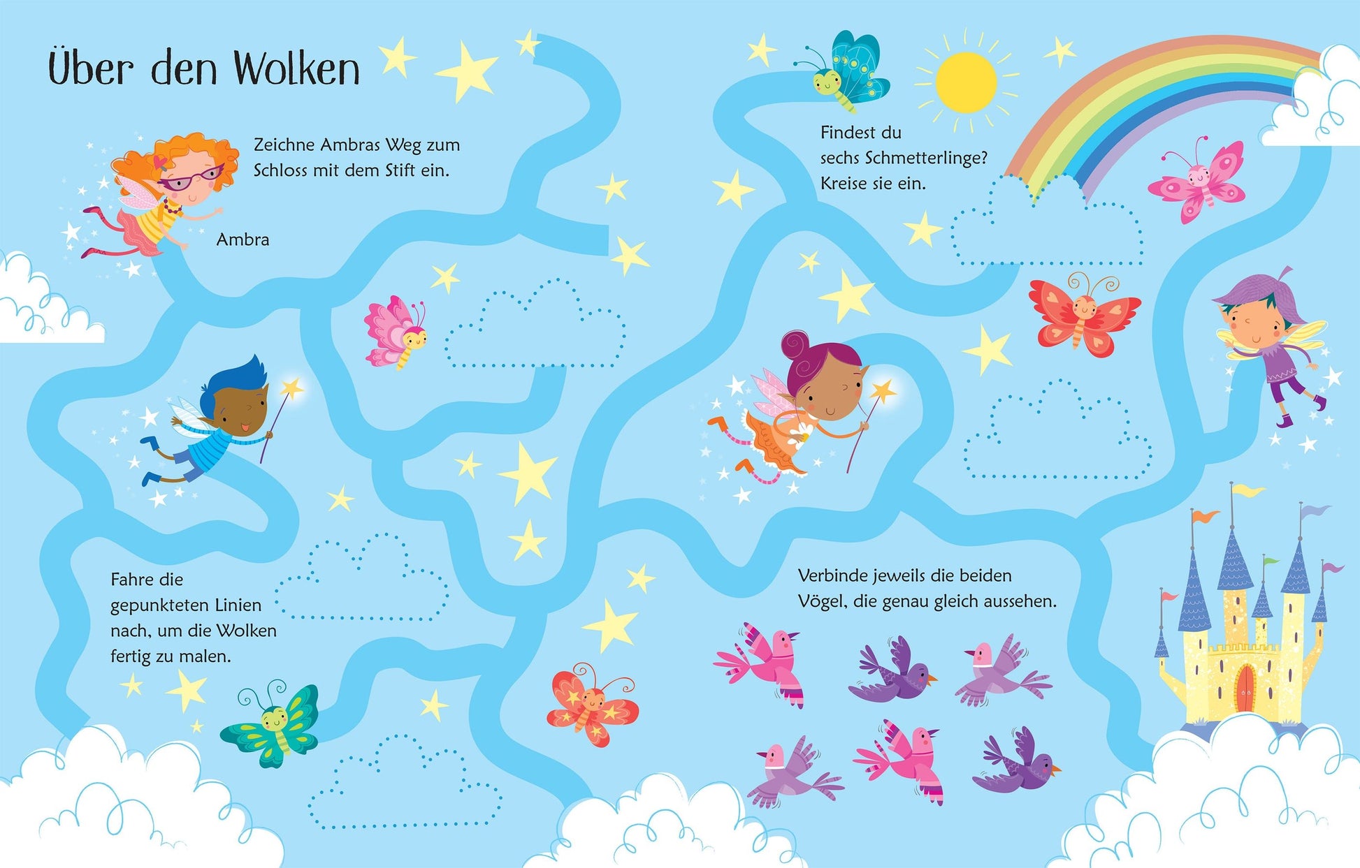 In diesem fröhlichen Buch gibt es jede Menge Labyrinthe, Finde-den-Unterschied- und Punkt-zu-Punkt-Rätsel für kleine Feen Fans. Zahlen und Linien zum Nachfahren üben den sicheren Umgang mit dem Stift. Und falls doch mal was danebengeht: einfach wegwischen und noch mal versuchen.