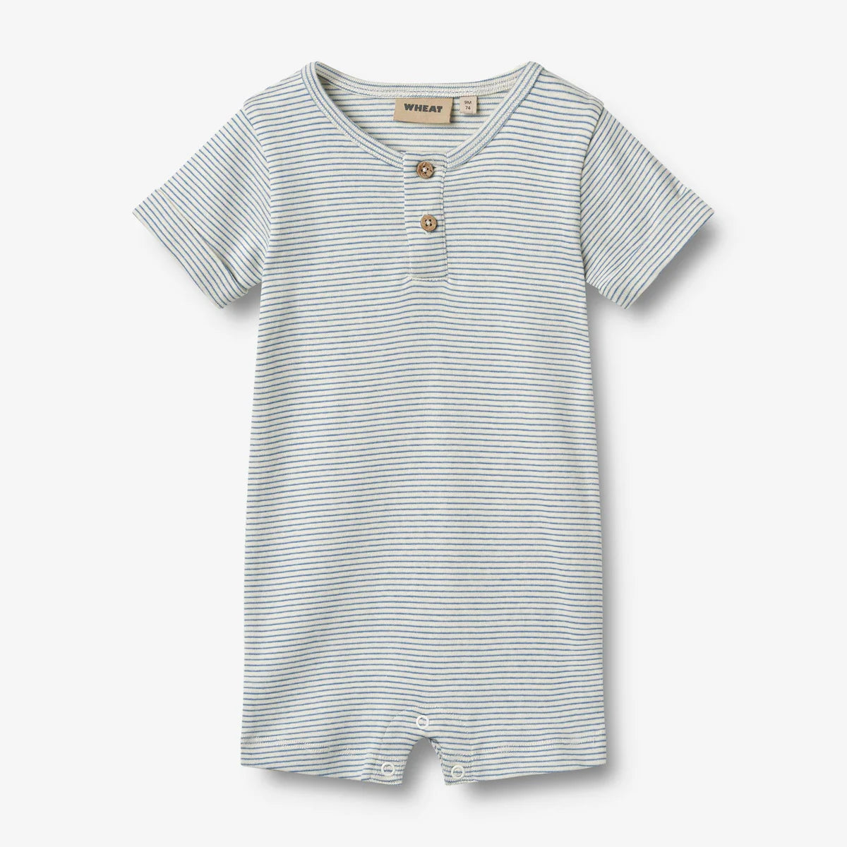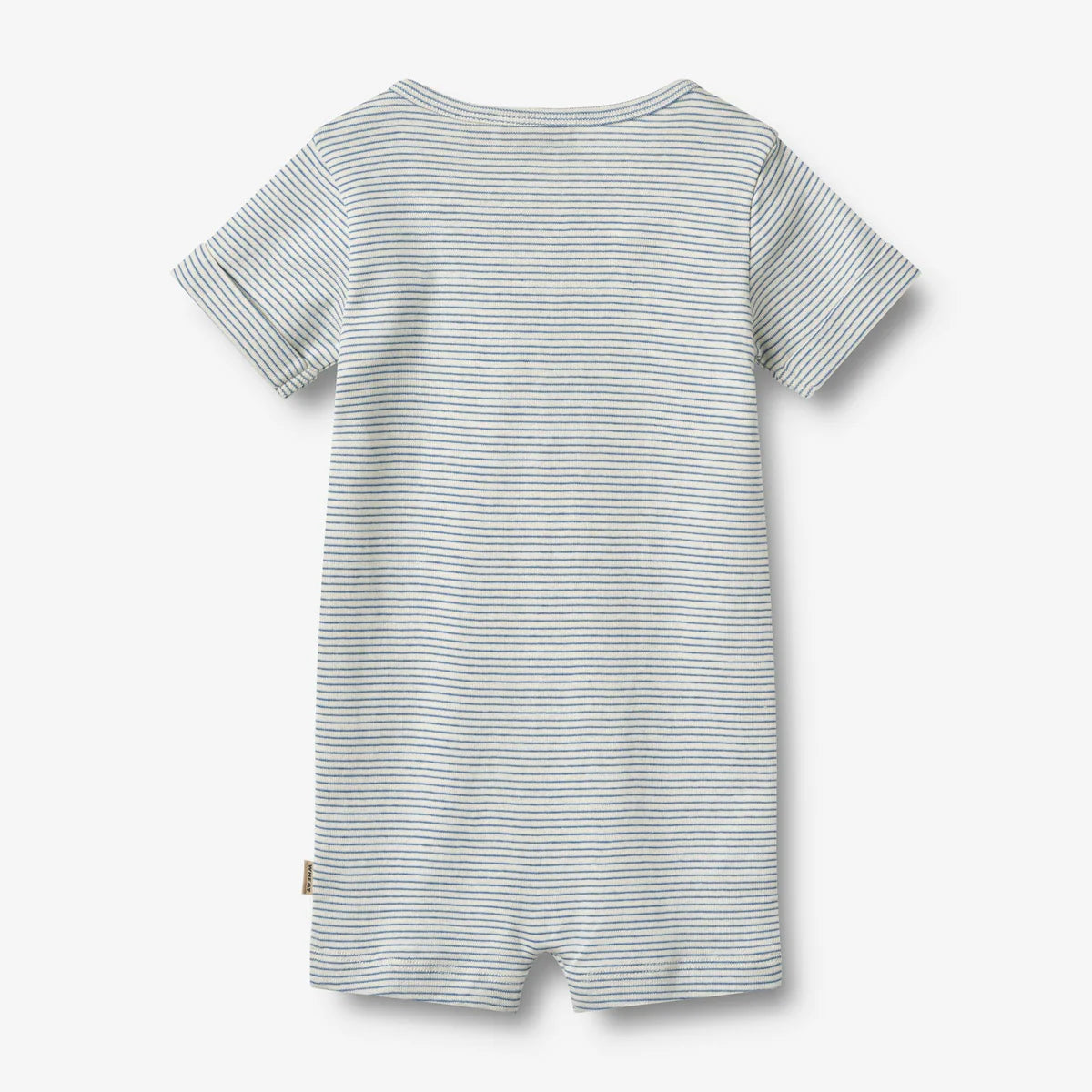 Gestreifter Jumpsuit mit kurzen Ärmeln und Beinen aus weicher Bio-Baumwolle für Babys.